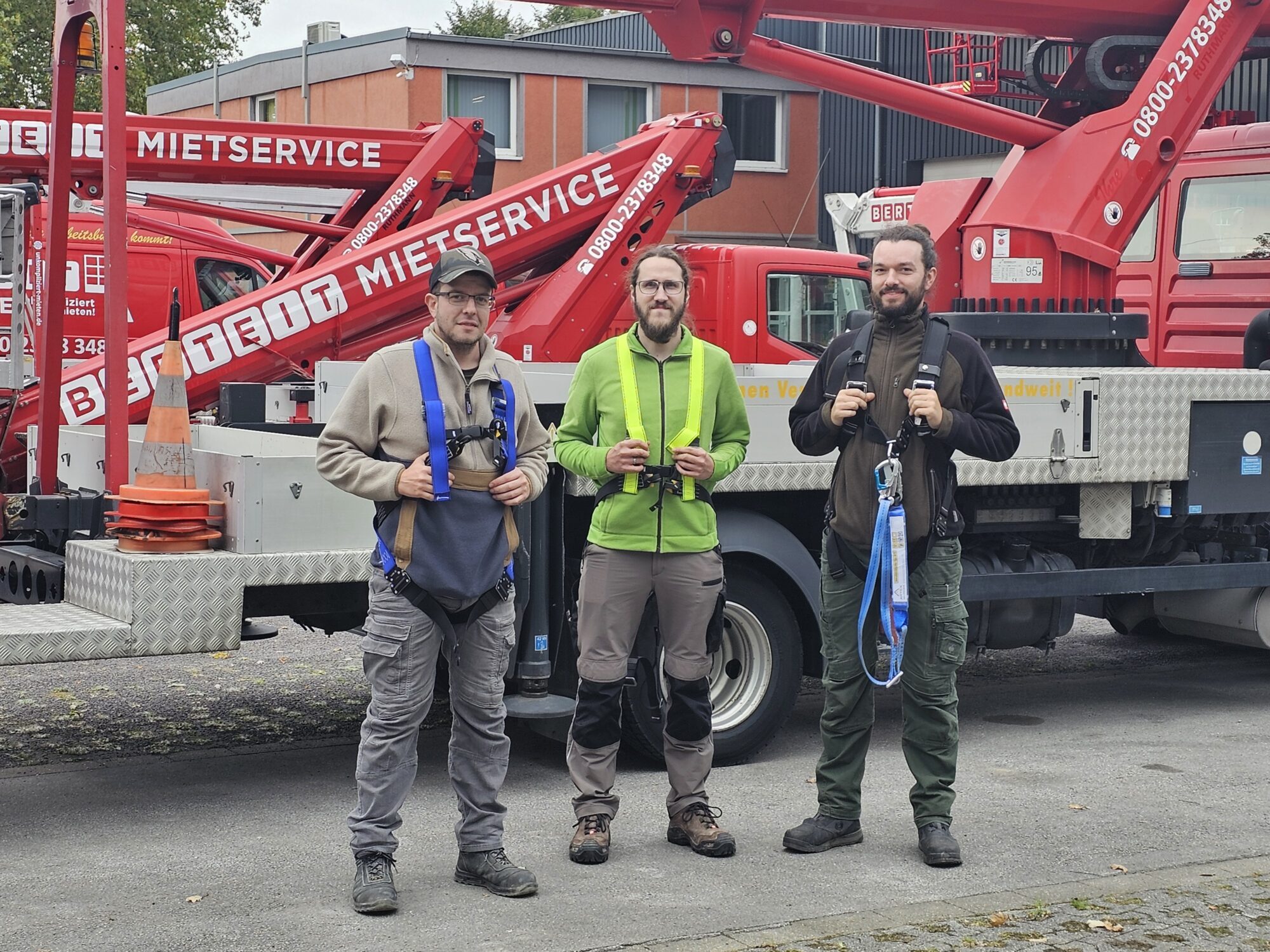 Vor diesem Hintergrund wurden unsere Mitarbeiter Björn, Dominik und Philip gemäß dem Arbeitsschutzgesetz und dem DGUV Grundsatz 308-008 in der Bedienung von Hubarbeitsbühnen Ende September bei unserem langjährigen Partner Berteit Mietservice GmbH in Herne ausgebildet.
